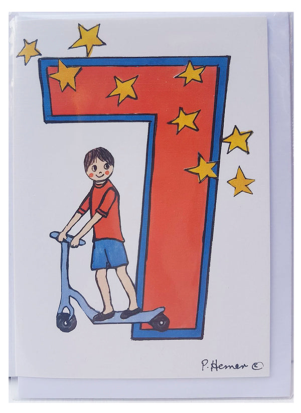 Australian designed birthday card showing a boy and his scooter and the number seven.By popular Australian Artist Paulene Hemer. Blank Inside. Includes envelope. Designed for Seven Year Olds