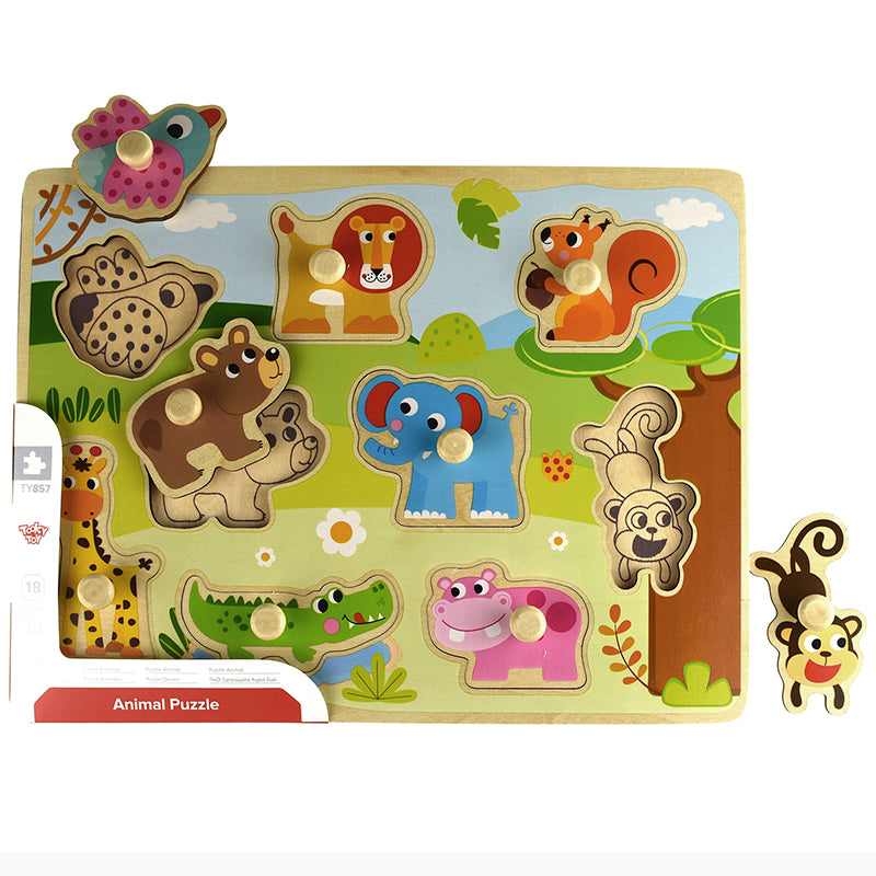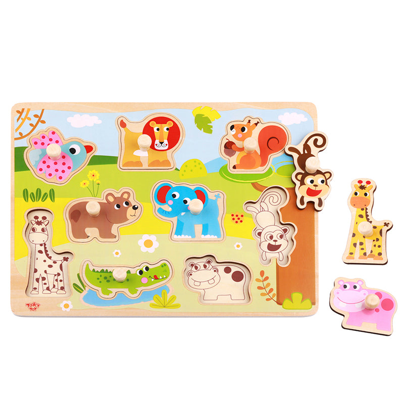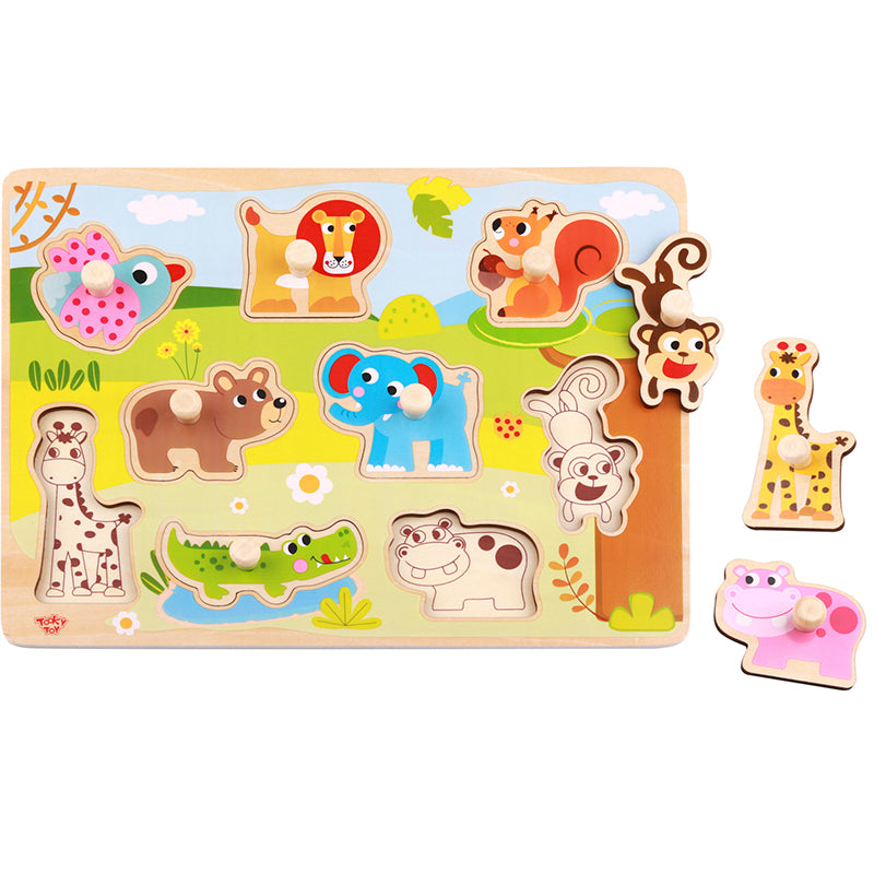 This peg puzzle helps children recognise different animals.Peg puzzles are great for teaching little ones to pick up and grasp pieces and they aid in the development of the pincher grasp. They also help with developing hand-eye coordination as a child places each piece in the puzzle they are manipulating it so see if it fits. With 9 puzzle pieces to lift and explore, your child will learn to match not only shape but also the corresponding silhouette in the inset underneath. Each wooden Jungle Animal Peg Puzzle from Tooky Toys is made from timber, finished to the highest quality and painted in child safe, non-toxic paint.Rec. Age: 18 Months + (TY857)