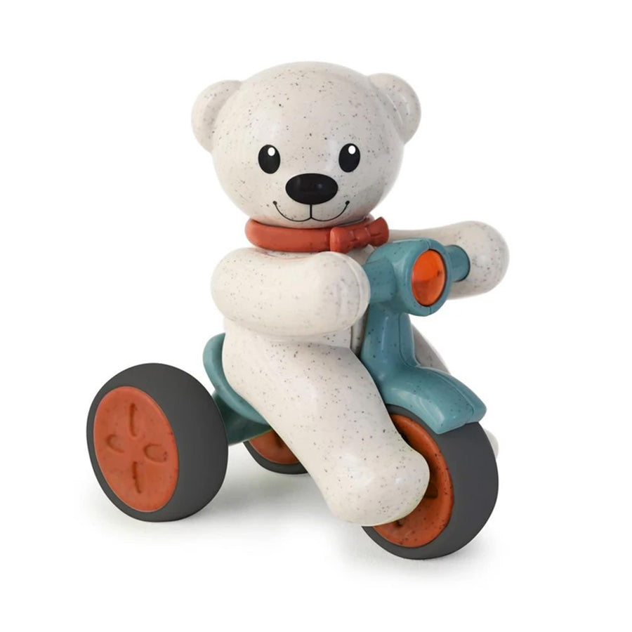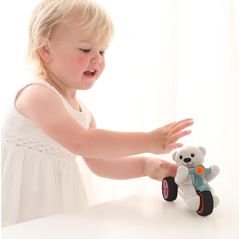 A classic wind-up toy with easy-to-learn and easy-to-use pump action. Pump the teddy to wind it up, let it go, and watch it move. Hours of fun for little ones. An early learning and developmental toy made from environmentally friendly wheat-fibre plastic. Develops fine motor skills.