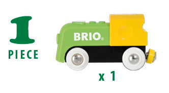 A classic style green and yellow battery operated engine. Press the arrow button on the top and the train is on its way. Press again and the train stops. The engine has a magnetic connector so it can connect with carriages and pull them around too. It is time for the youngest train drivers to play with a train that moves by itself. Ages: 18 months plus(BRI33705)