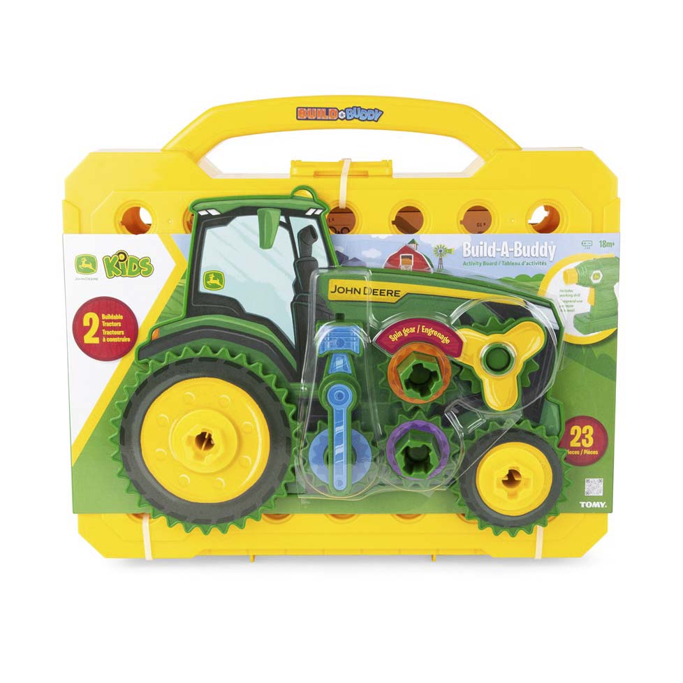 The John Deere Build-A-Buddy Activity Board takes building fun to the next level! Featuring 23 buildable pieces and a battery-operated drill, kids can create exciting farm adventures with 2 buildable scenes. The all-in-one storage keeps pieces organized. Recommended For 18 Months +