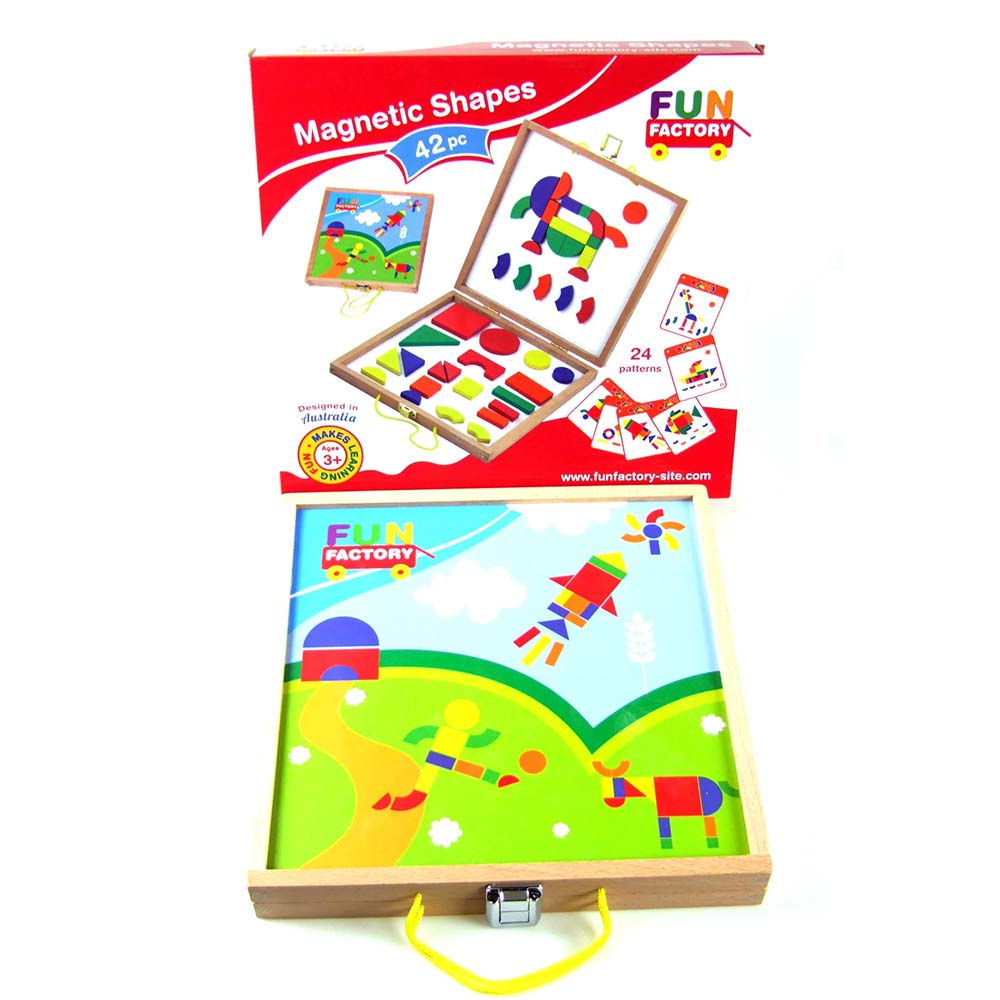 There are a selection of 42 magnetic pieces that match shapes on each pattern. Excellent for developing creativity, shape and colour awareness and problem solving ability The wooden case holds the playboards and shapes and packs away neatly.