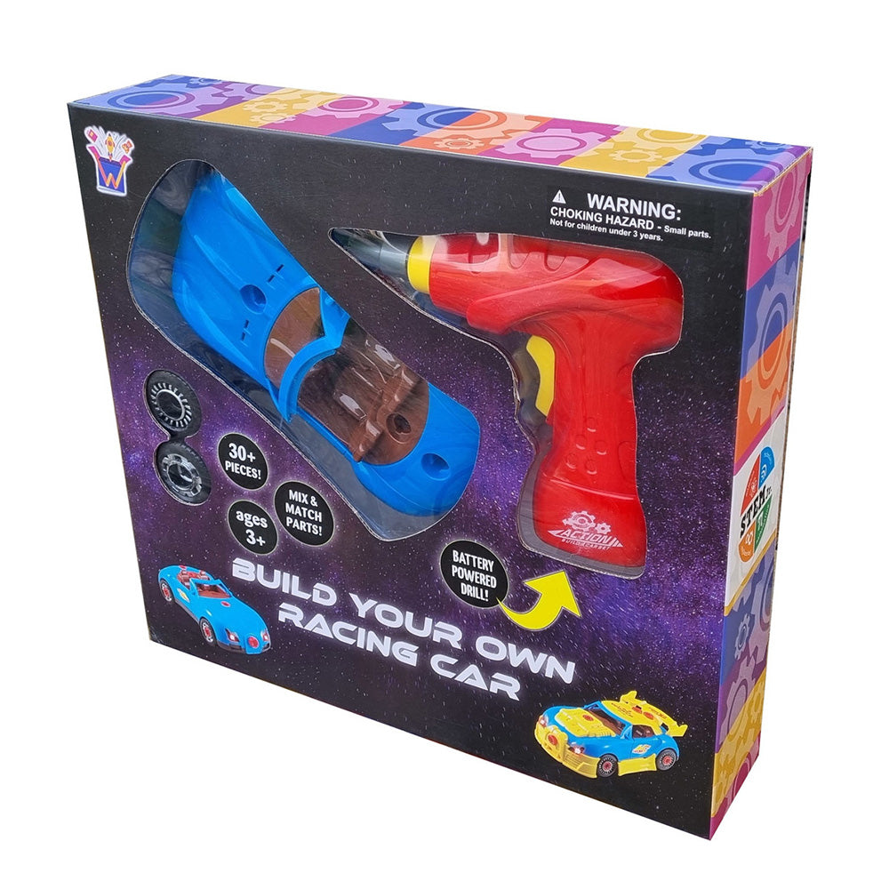 Build your very own racing car, you can mix and match the pieces to build different models. Includes a working drill for realistic play and the finished car makes sounds and has flashing lights.