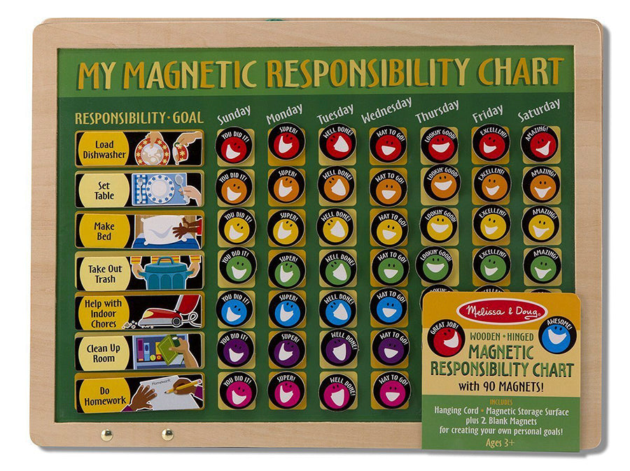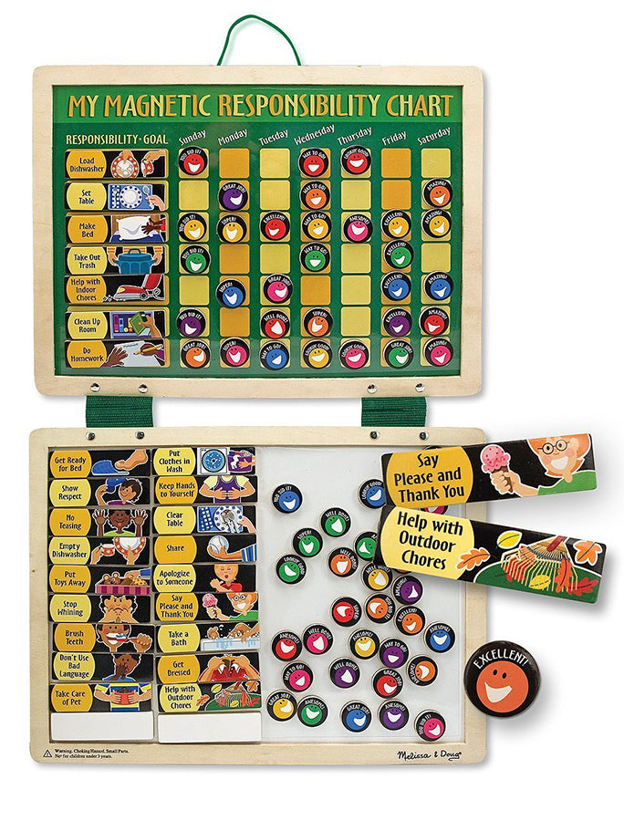 Reward children for being good, and watch those appropriate behaviours multiply! Open the fabric hinged boards to reveal a behaviour chart on one board, while the other board keeps all the magnets close at hand. A sturdy cord is attached for hanging. Dry-erase board and 134 magnets including responsibilities, positive behaviours and rewards. Here's a way to please (and thank you) everyone! Ages 3+