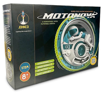 The MOTONOVA is a super cool racing monowheel that generates energy from the inertia of the flywheel. After force is applied, the magic flywheel stands up on its own and releases the power using rotational kinetic energy to drive the gearbox. It can stay balanced on a flat surface and will keep racing forward for up to 15 metres. By assembling it on your own, you can better understand the mechanisms of the gearbox. The transparent gearbox can be clearly seen so you can understand how the internal mechanism works while you are playing. Let it go and see how stable and how far it can go. You can try building obstacles with items like coloured pens to see if your MOTONOVA can knock them down. Fabulous STEM, educational toy - kids will have so much fun, they won't even notice that they are learning interesting scientific principles while playing.Recommended for ages 8 years+.