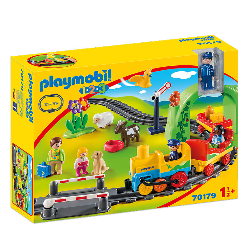 Playmobil 1.2.3 - My First Train Set 70179 is a first train set that is slightly larger scale. Playmobil 1.2.3 is designed for the 1 to 3 year agegroup. The Set Features 3 detachable coachesThe train can seat up to 3 figures, including the driver.Luggage and accessories can be stored in the end coach. Includes tracksWith 4 Playmobil figures, animals and accessoriesAges: 18+ months