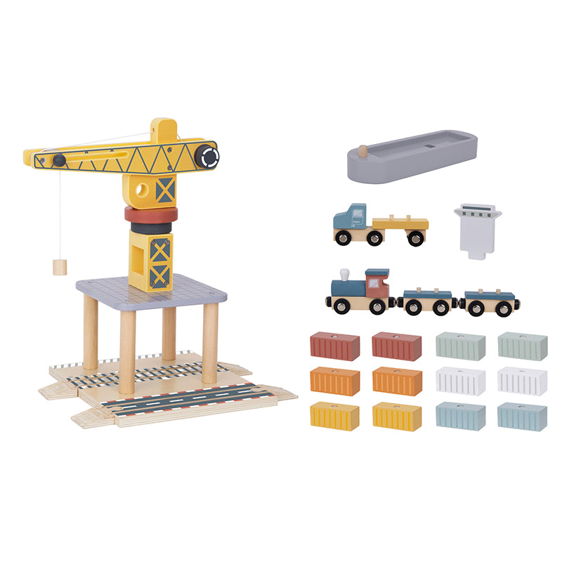 The Port Crane Set by Tooky Toy is a captivating playtime adventure that brings the bustling world of a harbour to life! This comprehensive set features a beautifully crafted wooden crane as the centerpiece, ready to load and unload cargo. Alongside the crane, you'll find a miniature train, truck, track, ship, and shipping containers, all designed to create an immersive port scene that sparks the imagination.As little ones take charge of the crane, they'll learn valuable skills like hand-eye coordination and problem-solving, all while orchestrating the efficient flow of goods in their bustling port. The wooden components are not only durable but also eco-friendly, ensuring a safe and sustainable play environment.The Port Crane Set is a gateway to endless adventures, allowing children to explore the concepts of transportation, logistics, and teamwork while having hours of fun. Whether it's loading containers onto the ship, sending the train on its journey, or delivering cargo by truck, this set invites creativity and storytelling, making it a must-have addition to any playroom.With Tooky Toy's Port Crane Set, young explorers can embark on exciting voyages, discovering the thrill of running their own bustling harbor right from the comfort of their play space.Rec. Age: 3 Years +