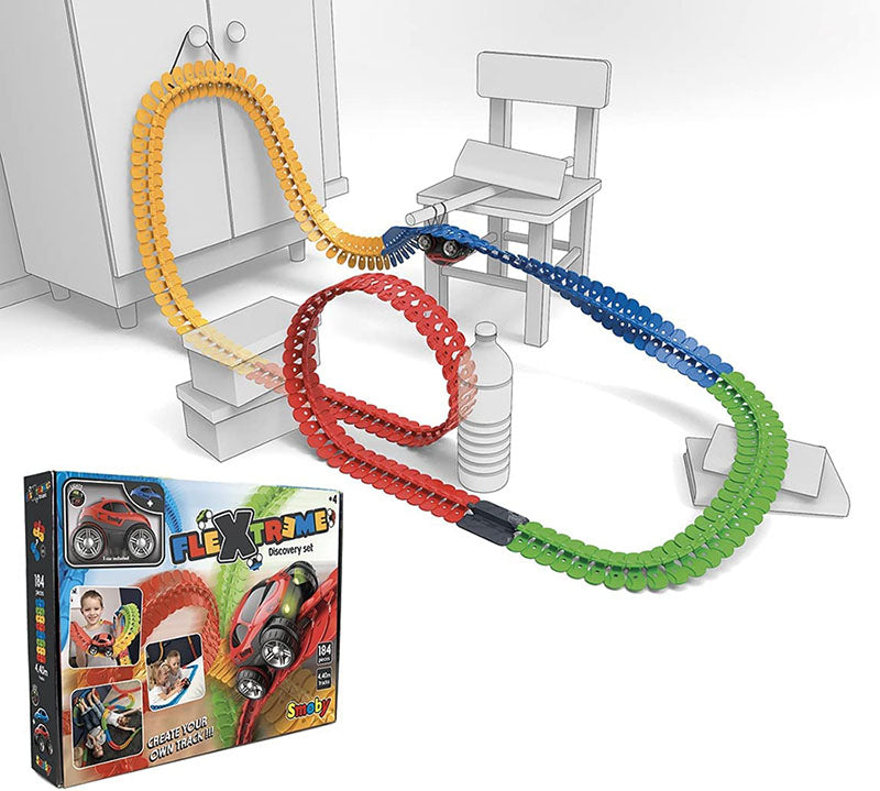 A fun and creative car racing set that allows kids to build amazing flexible racetracks for a powerful racing car. Your child will be excited when they discover that the car will travel up the track and can go up and over objects such a chair or bed all by itself. It can even do a loop. The car has working lights and in the dark the car glows up the track as it moves. There is loads of track supplied and easy to use instructions with different ways to set up the track. Set Includes:• 184 tracks • 1 vehicle • 1 additional car body