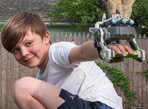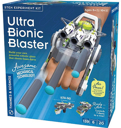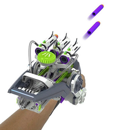 Build it first, then you can play! Have a blast with this awesome engineering project!Construct an air-powered robotic glove that launches safe foam darts. Learn about pneumatics - technologies that use pressurized air to perform work - and many cool mechanisms as you assemble the blaster from over 100 pieces.After you’ve built and tested your blaster, slide it on and strap it to your wrist. The first pull of the trigger causes the scissor arm to lift the barrels and launch the first dart. Pull the trigger two more times to launch the next two darts.Grab some additional darts from the reserve clip under your wrist and reload.The blaster is entirely powered by your hand and the amazing pneumatic system — no batteries or motors required!Turn the dial to rotate the two outer launchers for a wider spread. Adjust the location of the wrist strap to fit almost all hands. A full-colour, step-by-step manual guides you through assembling and using the blaster and provides fascinating scientific information about pneumatic systems and the physics of air.Adjust to fit almost any hand size.Compatible with many standard foam dartsRecommended for ages 8 years +