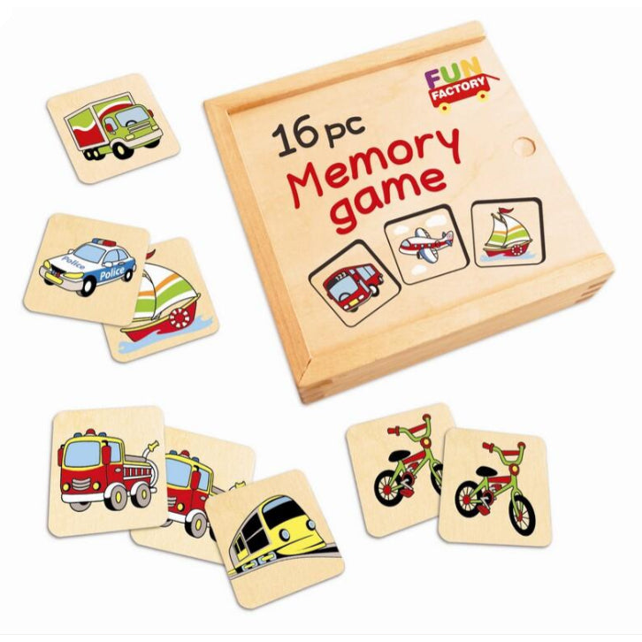 A cute little wooden memory game in a wooden box. The box contains 16 wooden cards in pairs. The pictures are of different means of transport including bikes, boats, trains, trucks, buses, police cars and fire engines. Brightly coloured non toxic paint. The perfect first game. Ages 3+